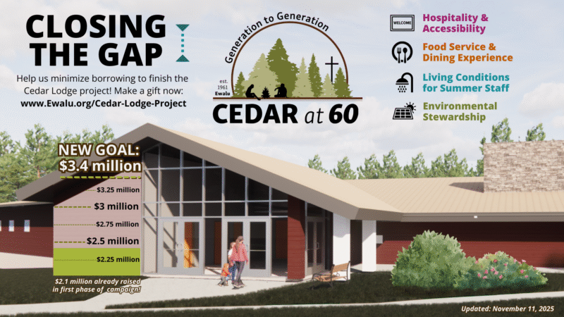 “We are overjoyed and grateful to Candy and Rich for this incredible gift to Ewalu,” said Frank Johnson, executive director at Ewalu. “We give thanks to God for all the campers, school groups, young adult summer staff, alumni, adult enrichment attendees, and rental partners who will reap the benefits of a new, modernized, beautiful Cedar Lodge. With this gift, we are eager to make the new Cedar Lodge a reality as soon as possible.”